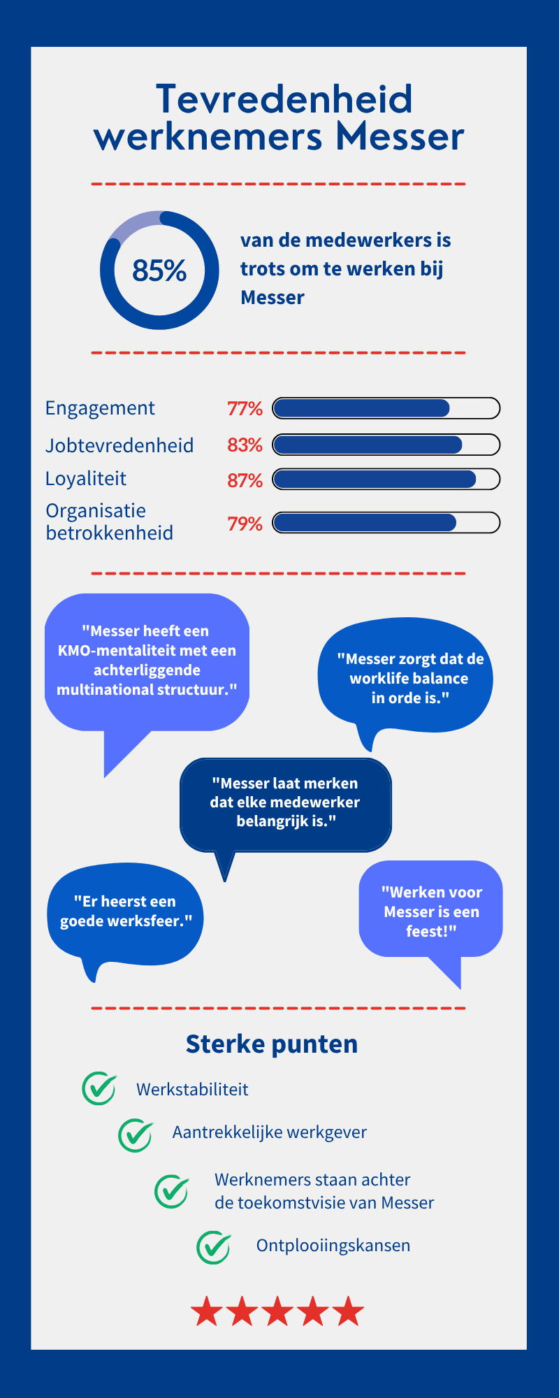 Nos collaborateurs sont au cœur de Messer. C'est pourquoi nous sommes particulièrement fiers des commentaires positifs qu'ils ont récemment formulés. Leur satisfaction a clairement augmenté, ce qui se reflète également dans notre collaboration quotidienne. L'infographie et la vidéo ci-dessous résument clairement ces beaux résultats et montrent comment notre culture d'entreprise continue de croître et de se renforcer.