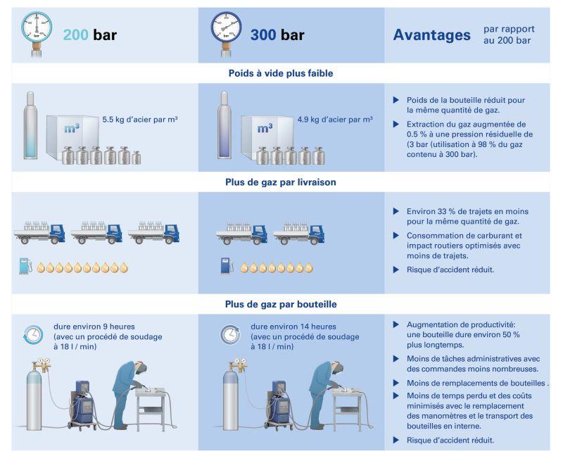 La technologie 300 bar permet de réduire le nombre de bouteilles louées, et donc de réduire les coûts de location par rapport à la technologie 200 bar.