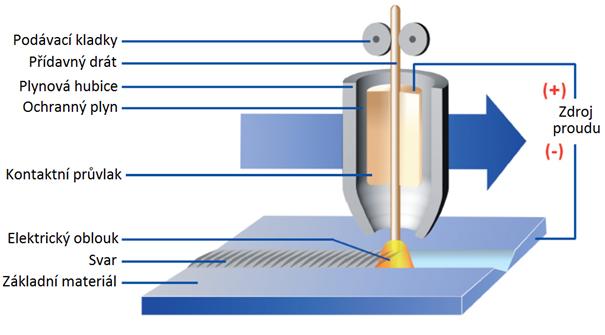 Svařování metodami MIG/MAG využívá k získání potřebné tepelné energie elektrického oblouku, který hoří mezi odtavující se drátovou elektrodou a základním materiálem. Svarová lázeň a její blízké okolí je ochráněno ochranným plynem, který zamezuju přístupu okolní atmosféry. Chemické složení ochranného plynu je rozdělujícím faktorem metod MIG a MAG. Metoda MIG používá k ochranně svarové lázně inertního (netečného) plynu, zatímco metoda MAG plynu aktivního. Přídavný materiál ve formě drátu je podáván do hořáku.