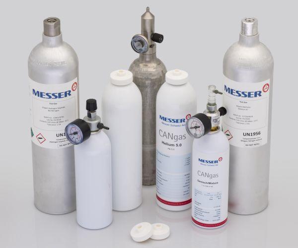 Messer liefert die Druckgasdosen in verschiedenen Grössen mit reinen Gasen oder mit Testgasen für die verschiedensten Zwecke.