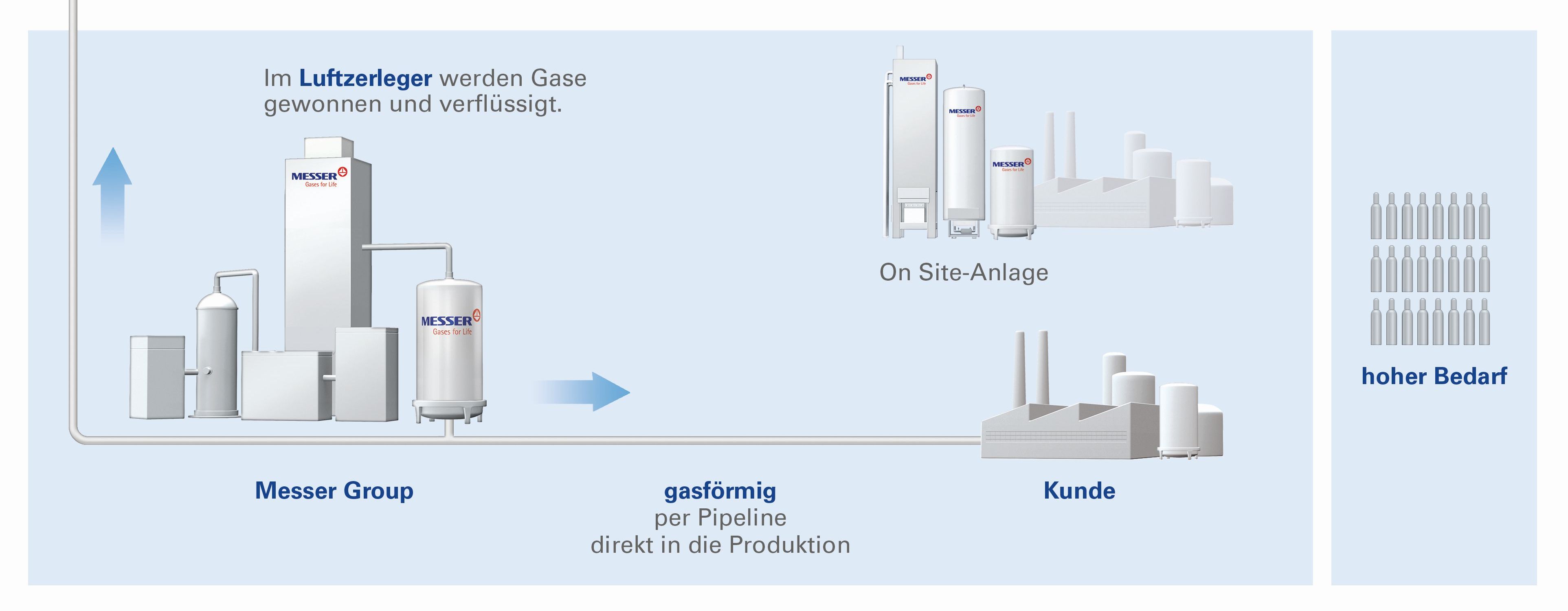 Die geforderten Mengen und Reinheiten der Gase hängen wesentlich von der jeweiligen Branche und den eingesetzten Verfahrensanwendungen ab. Daher bietet Messer seinen Kunden ein massgeschneidertes Versorgungskonzept an, das exakt den individuellen Anforderungen entspricht.