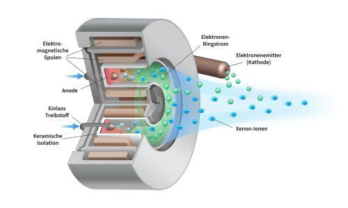 Sobald ein Xenon-Atom mit einem Elektron zusammenstösst, wird es ionisiert und durch das elektrische Feld in Richtung Triebwerksausgang beschleunigt. Der daraus resultierende Rückstoss erzeugt einen Schub, welcher den Satelliten antreibt. Die ausgestossenen Ionen bilden mit weiteren Elektronen aus dem Emitter ein elektrisch neutrales Plasma, was einen effizienten Betrieb von Satelliten und Raumsonden im Weltraum ermöglicht.