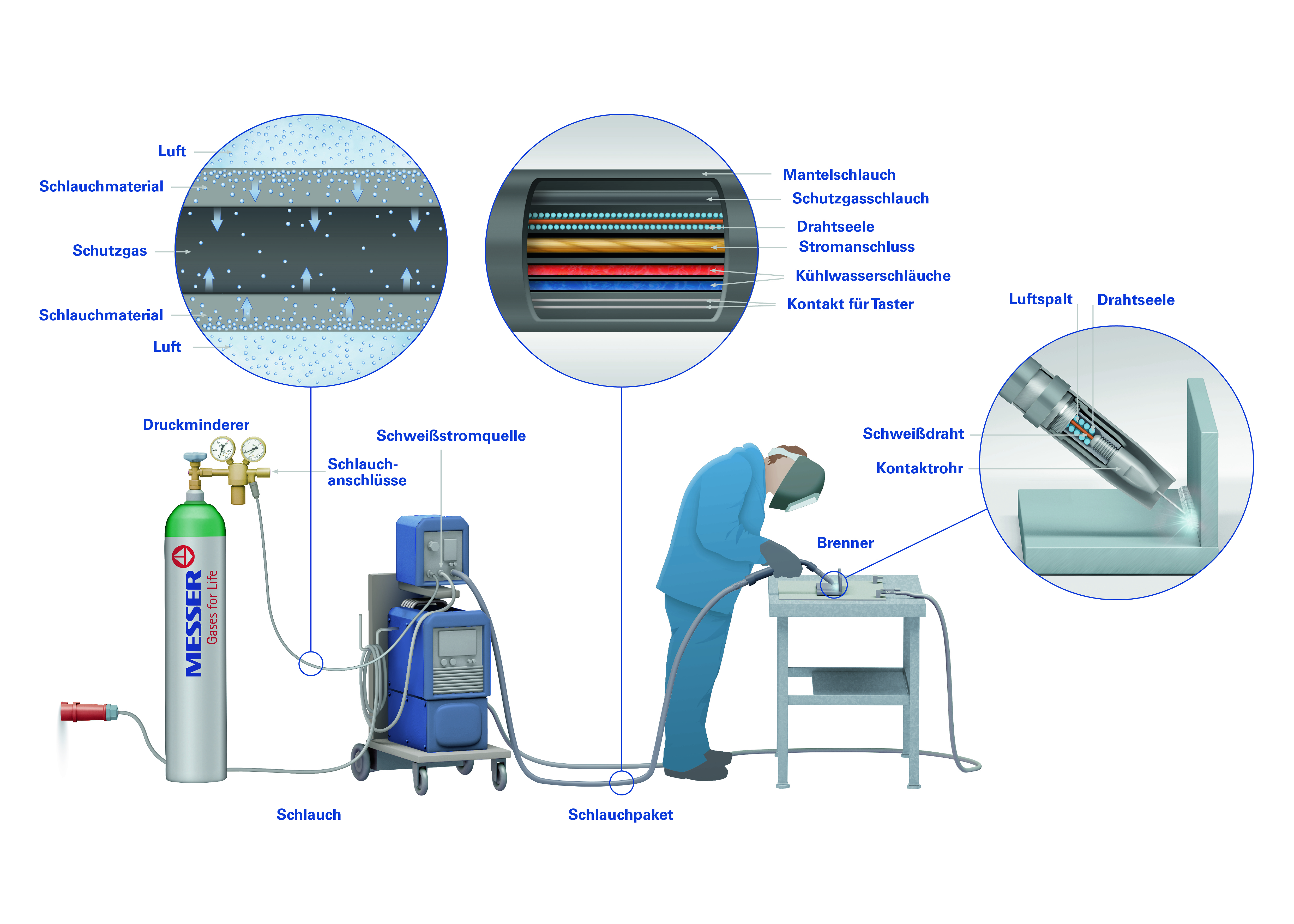 Fehler bei der Schweisstechnik können die Qualität der Schweissnaht mindern. Sie sind häufig auf das Equipment zurückzuführen, die eine Verunreinigung des MAG Schweisgases auf dem Weg von der Gasflasche zum Lichtbogen verursachen können.