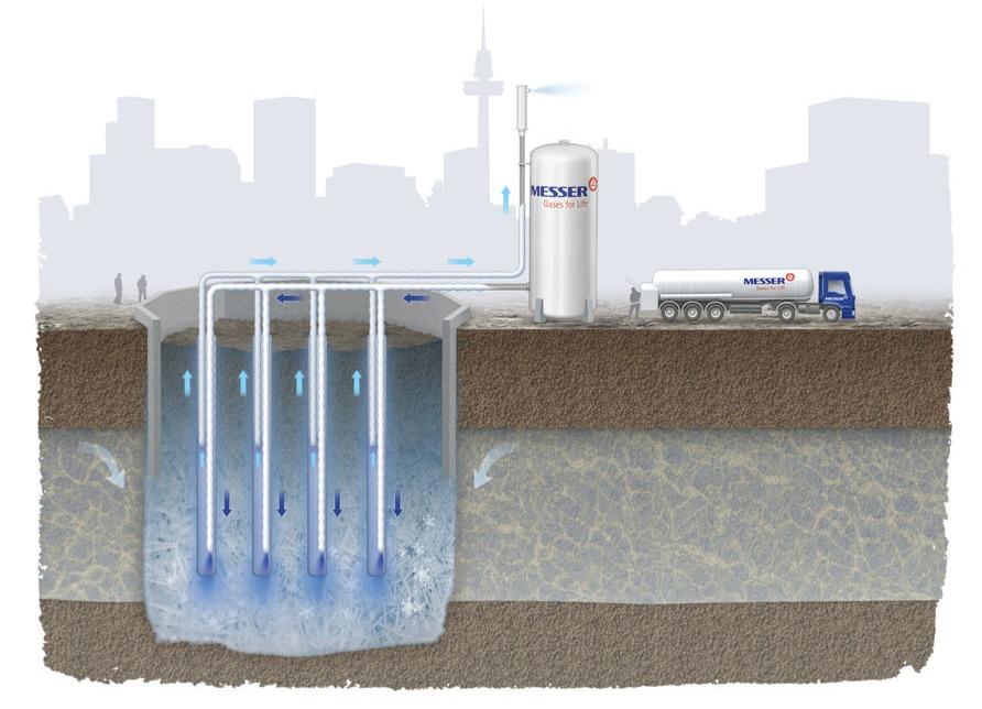 Metóda zmrazovania pôdy kvapalným dusíkom umožňuje spoľahlivé utesnenie stavebných jám a tunelových vrtov proti podzemnej vode a vlhkej pôde. Tento proces je:
